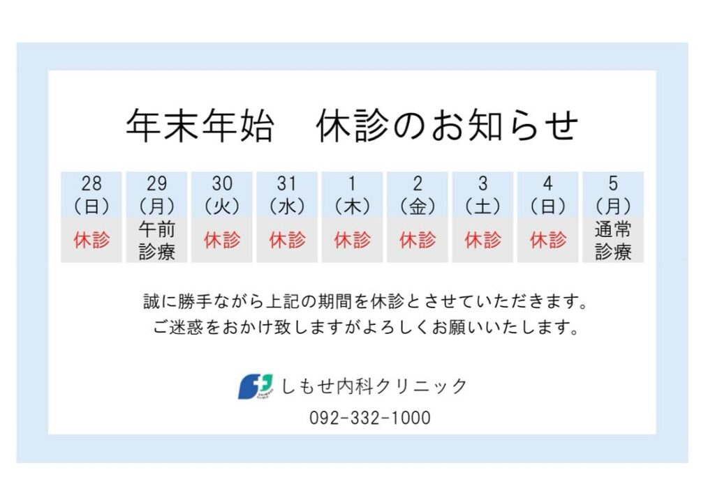 しもせ内科クリニックです🏥 年末年始のスケジュールです。お間違えのないようにお願いします🙇 インフルエンザも流行しております。手洗い、うがいの徹底をお願いします‼️ またお悩みの事などあればいつでもご相談下さい。